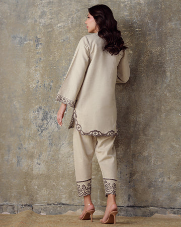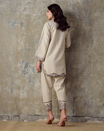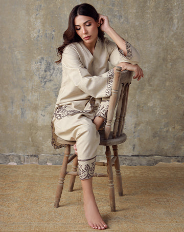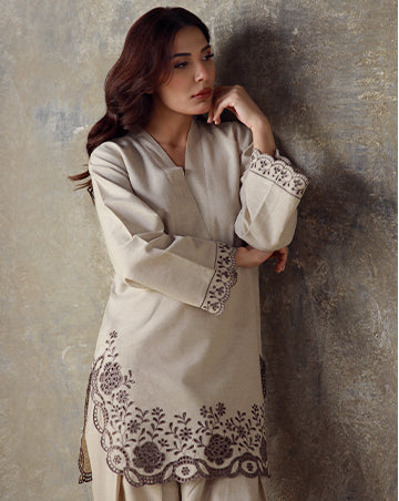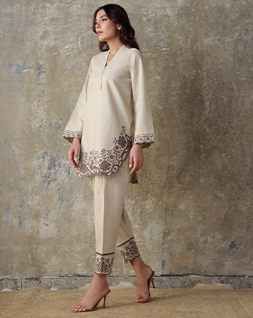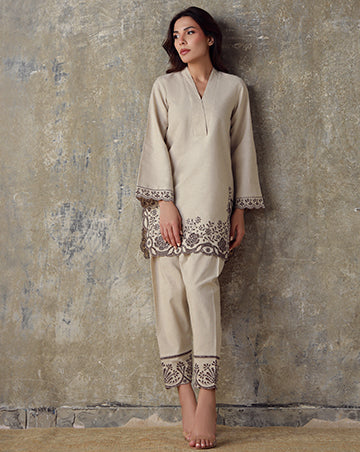 Subtle yet striking, this beige Irish Cotton attire is enhanced with delicate embroidery on the shirt and paired with a sleek skinny shalwar. The look captures effortless sophistication with modern ease.