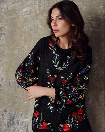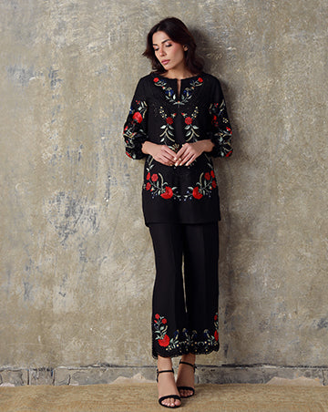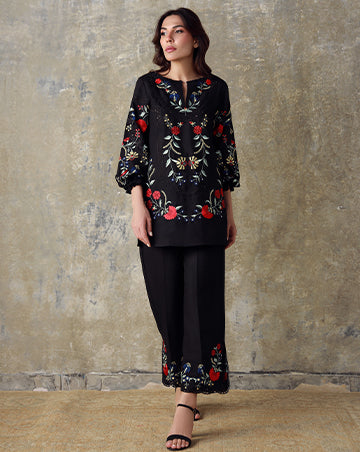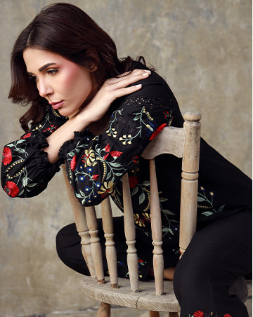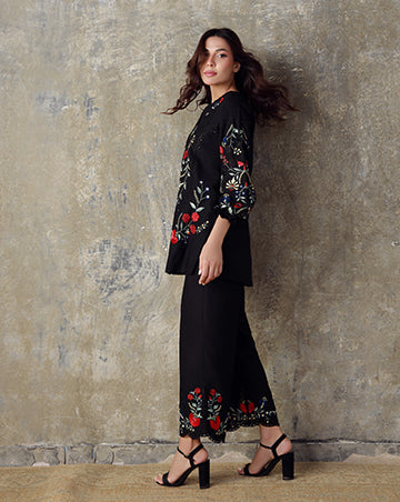 Elegant and timeless, this black Irish Cotton ensemble is adorned with embroidery on the shirt, sleeves, and culottes. With its refined detailing, SHAZA embodies contemporary grace and enduring style.